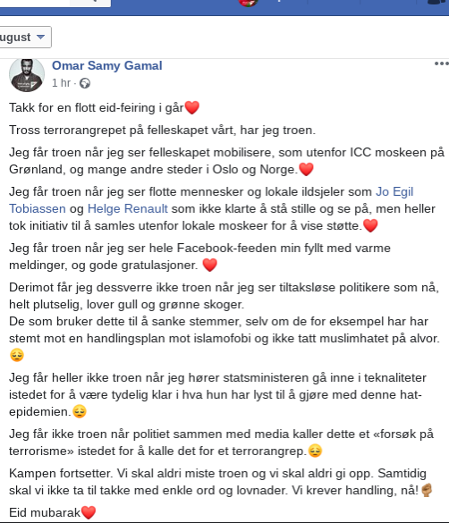 «Jeg får troen når jeg ser flotte mennesker og lokale ildsjeler som Jo Egil Tobiassen og Helge Renault som ikke klarte å stå stille og se på», sier Omar Samy Gamal (Oslo SVs 3. Kandidat.) Vi trenger handlinger og ord som inspirerer oss til å tro på samhold, og som bygger tillit mellom grupper i samfunnet vårt.