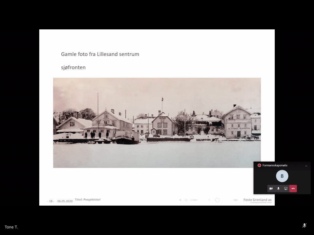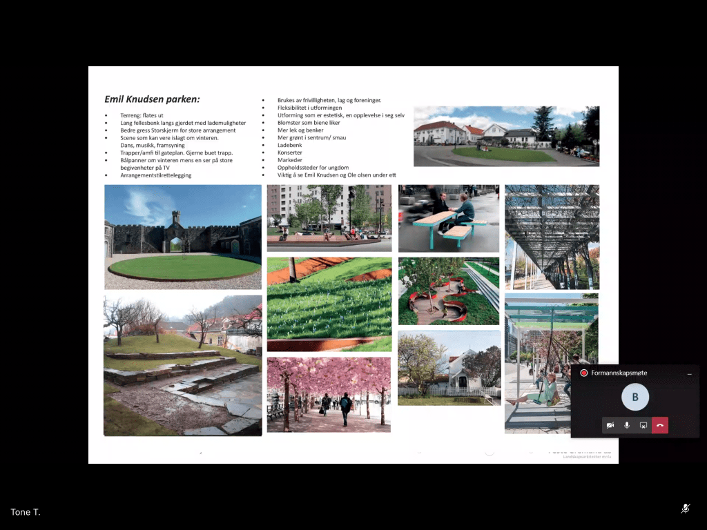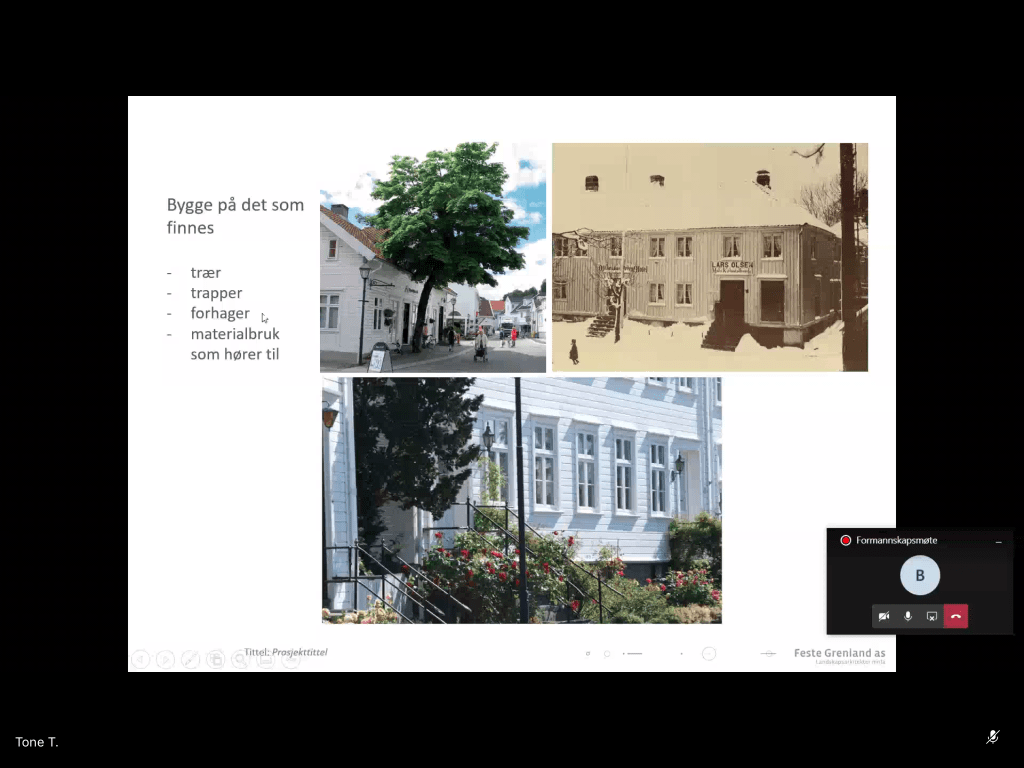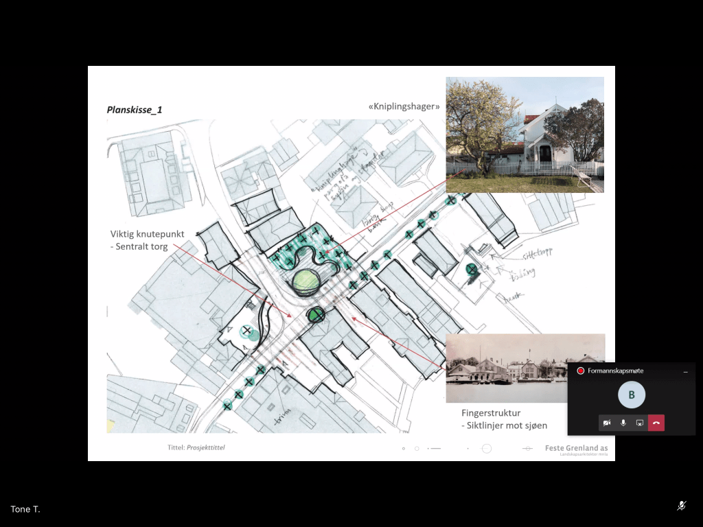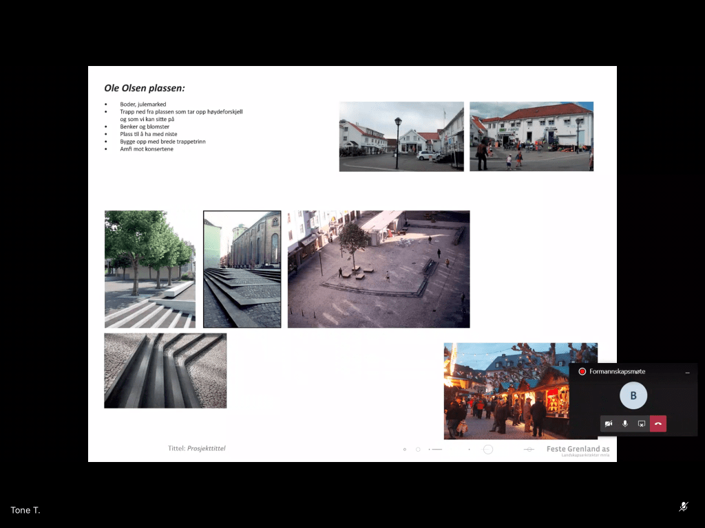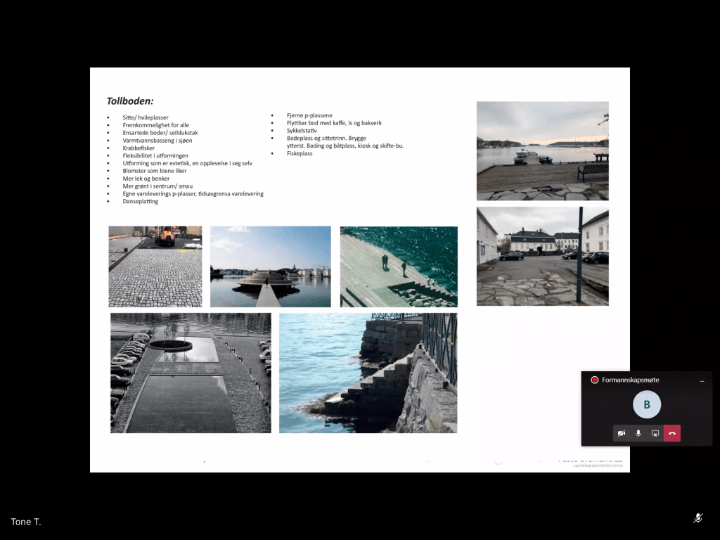 Emil knudsens plass var bebygd.Sjøfronten er ganske lik og det er et mål å bevare den.Når ble husene bygget?Element av lek, fleksibel bruk, ikke lekeplass, for eksempel gyngebenker i byromstak.Ole Olsens plass: Trappeelement. Lett å sitte. Høye trapper opp til bygg (Identitet), rom for marked. Må tilpasse funksjonshemmede: Flere punkt hvor man kommer inn. Utfordring med trapper. Mest mulig tilgang.Tolboden: opprettholde åpen plass, kulturminnevern, lage et vakkert tregulv med vannspeil, siktlinjer fra hus bak viktig, trapper mot sjø og pir er mulighet.Lave trær og busker: Innspill fra Sentrumsforum som bla består av handelsstand og gårdeiere har ført til mindre trær.Sentralt torg i stedet for kryss.Byromstak. Gulv er viktig, få til grønn frodighet som referanse til historiske forhager, og peke framover mot bærekraft (Blomsterprosjekt).Vi kan teste ut noen av ideene som popup-prosjekter for eksempel lage grønn park på dugnad, paller for nivå og blomsterprosjekt.